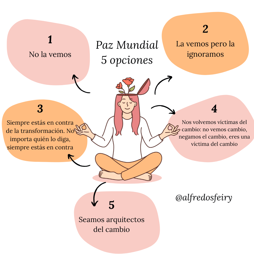 La paz mundial no es una utopía lejana ni un ideal inalcanzable, sino una elección consciente frente al cambio y a los procesos de transformación que atraviesa la humanidad. Muchas veces no la vemos, la ignoramos, la resistimos o nos posicionamos como víctimas del cambio, negando nuestra capacidad de influencia. Sin embargo, la paz global comienza cuando cada persona decide asumir un rol activo y responsable, dejando la oposición automática y el miedo para convertirse en arquitecto del cambio. Este camino requiere conciencia, compromiso y acción alineada, comprendiendo que la verdadera transformación colectiva nace del trabajo interior individual y del reconocimiento de que el futuro humano se construye de manera compartida.